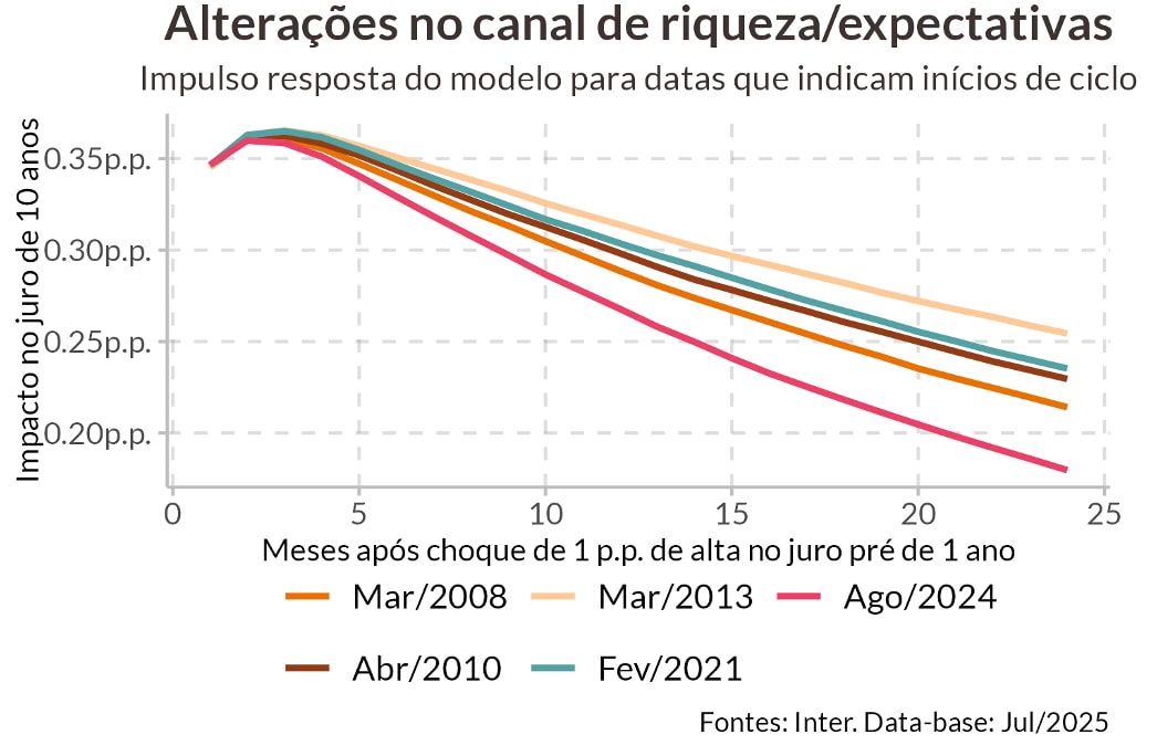 Ao definir a taxa básica de juros, o Banco Central consegue balizar as expectativas para os juros de curto e longo prazo, sendo os juros de curto prazo mais reflexivos da provável trajetória da política monetária. Já os juros de longo prazo influenciam a precificação de ativos financeiros na economia, de tal forma que um aumento na taxa de juros longa reduz o preço de ativos financeiros como títulos e ações; por consequência, famílias que são significativamente expostas nesta classe de ativos sofrem redução de riqueza e também na capacidade de financiar seu consumo na margem, constituindo outro meio pelo qual o BC pode exercer influência na atividade econômica.