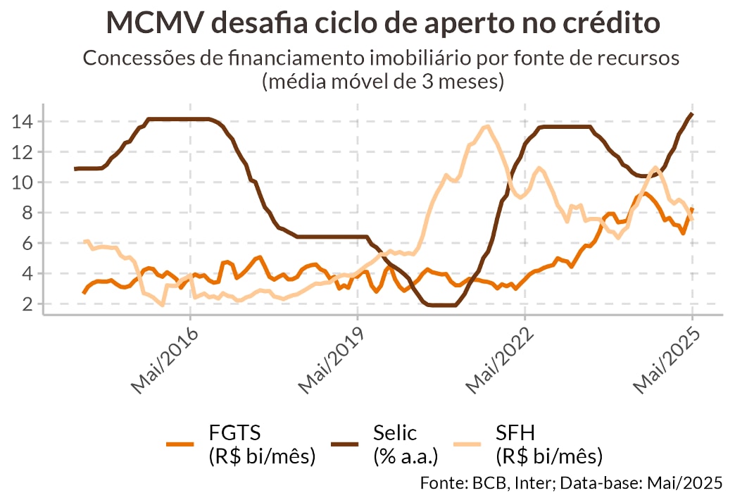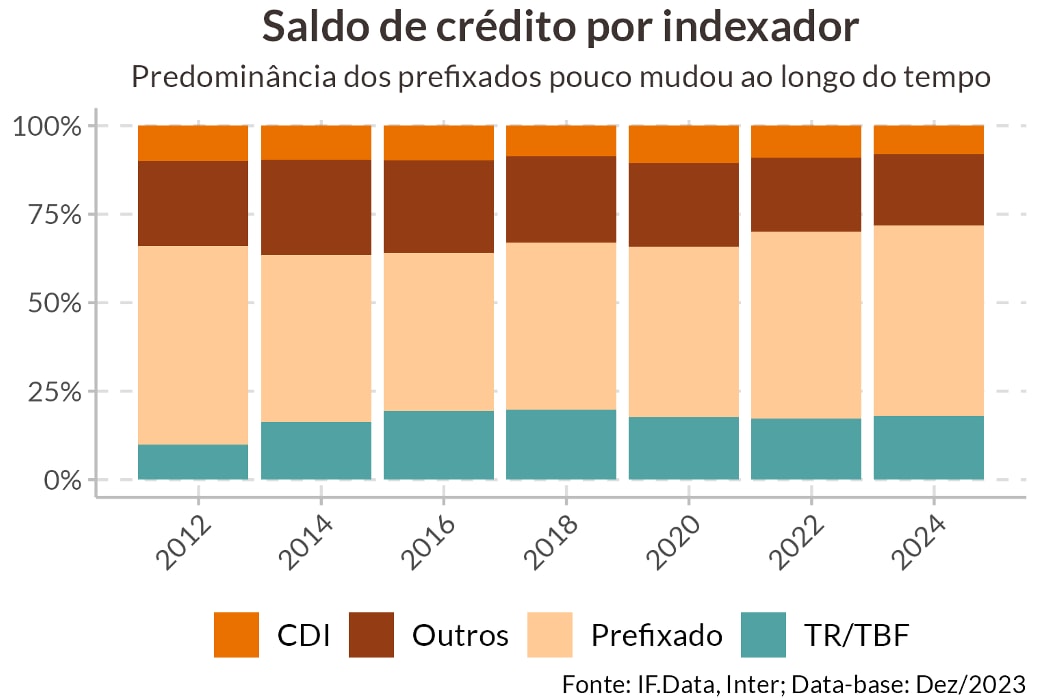 De todo modo, mesmo com a implementação de medidas para reduzir essas distorções, o comportamento do crédito no Brasil permanece razoavelmente engessado com 54% de todo o saldo de crédito contando com indexadores prefixados e 42% de todo o saldo sendo constituído de crédito direcionado. Ressalta-se, em particular, a provável distorção vinda do segmento imobiliário (cuja carteira corresponde a 30% de todo o crédito destinado às famílias) por conta da ascensão do MCMV, cujas concessões mais que dobraram em três anos após medidas de estímulo implementadas pelo governo, como a recente expansão para a Faixa 4 que abrange famílias de renda bem superior à mediana.