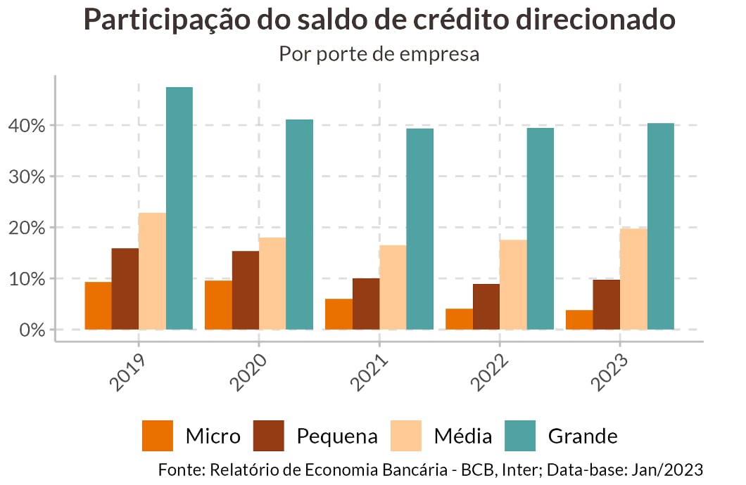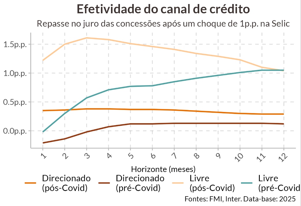Num estudo recente conduzido pelo FMI, que estimou a transmissão do canal de crédito no Brasil por meio da análise de choques de política monetária, a taxa de repasse para o crédito livre é praticamente integral e se materializa nos primeiros três meses após o choque, enquanto o repasse para o crédito direcionado fica mais próximo de apenas 0,2p.p. para cada 1p.p. de choque, demorando cerca de cinco meses para se materializar.