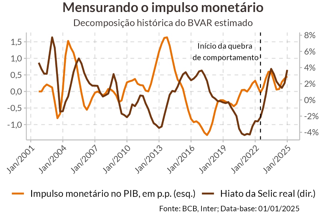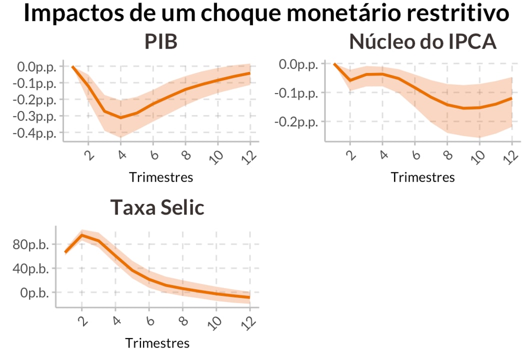 Para avaliar a potência da política monetária, utilizamos modelos estatísticos capazes de isolar os efeitos de um choque monetário “genuíno”. Historicamente, tal choque aumenta a taxa Selic mas não gera impactos imediatos, com os primeiros efeitos aparecendo primeiro no PIB e posteriormente na inflação.