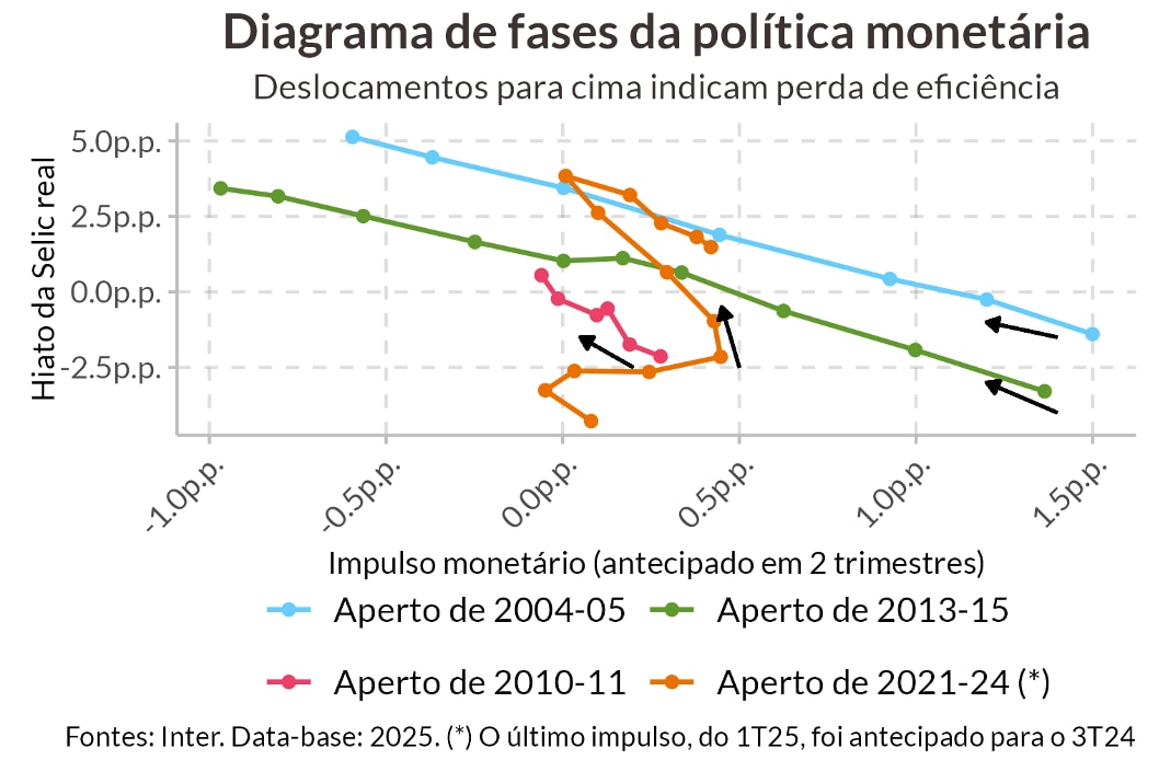 Comparando o ciclo de aperto visto desde 2021 com ciclos recentes em nossa história, vemos como a política monetária atual quase não teve impacto sobre o PIB, com o diagrama de fases praticamente vertical, um indício de perda de potência da política monetária. Parte desse movimento pode ser explicado pelo período de juro real negativo observado durante a pandemia, mas recentemente esse movimento também teve influência da política fiscal, que atuou para imunizar a economia dos impactos monetários.