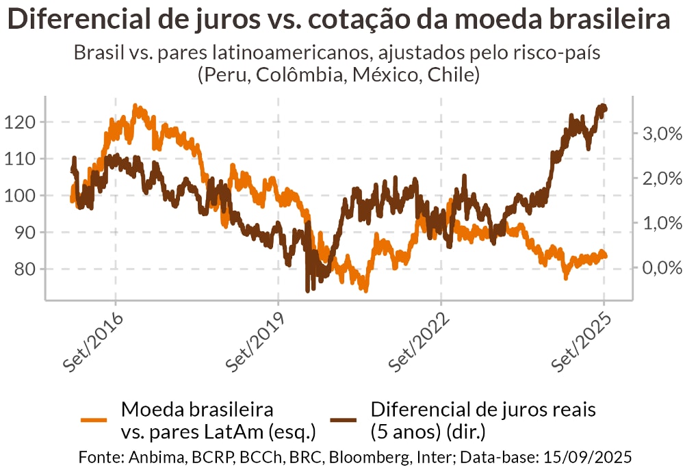 Ao longo da última década, percebe-se uma tendência de comovimento das duas medidas a médio prazo apesar de breves inversões de sinal no curto prazo. Esse comportamento, todavia, foi quebrado em meados de 2024, período em que as preocupações fiscais aumentaram e podem explicar a ausência de apreciação do real em meio ao significativo diferencial de juros.
