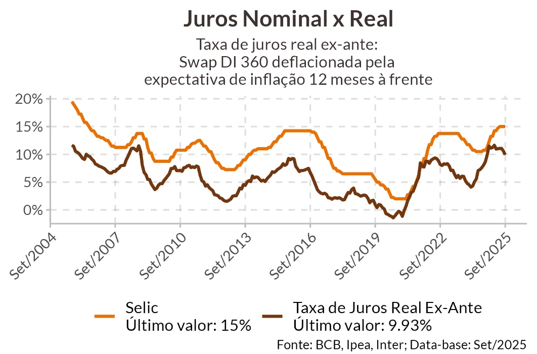 No atual ciclo de aperto monetário, a Selic chegou em 15%, o maior patamar visto em quase vinte anos, o terceiro mais agressivo desde o início do regime de metas de inflação, perdendo apenas para os ajustes pós-pandemia em 2021 e do “Efeito Lula” em 2002-03. Dado o referencial histórico, o choque de juros implementado coloca a política monetária, em território bastante contracionista, o que ocorre desde meados de 2022.