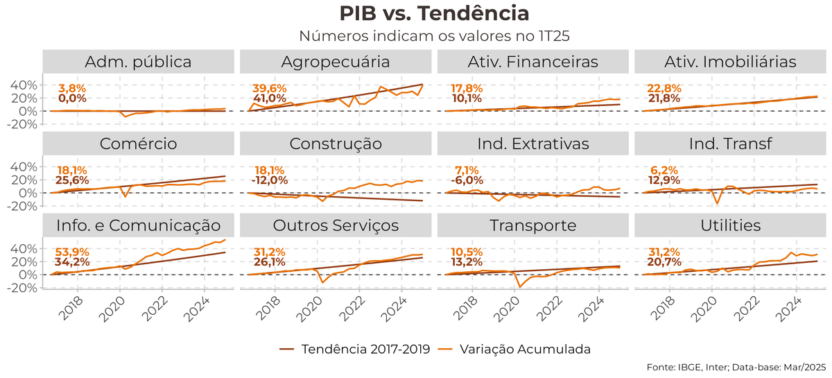 • A formação bruta de capital fixo subiu 3,1% no trimestre, no melhor resultado desde o 1T24 influenciado pelos segmentos de construção, extração de petróleo, e desenvolvimento de softwares.