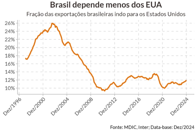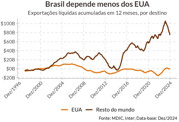 Adicionalmente, mesmo num eventual cenário de tarifas, é pouco provável que as medidas tenham impacto substancial na saúde do setor externo brasileiro: com a alteração da matriz comercial ao longo das últimas duas décadas, fruto da especialização em commodities agrícolas, o país reduziu sua dependência de exportações aos americanos pela metade, e o superávit comercial que existia até meados dos anos 2000 se converteu num déficit crônico que, atualmente, se situa ligeiramente abaixo de um equilíbrio, em comparação com os US$75 bilhões de exportações líquidas feitas ao resto do mundo.
