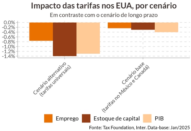 Entretanto, se o objetivo é esse, os efeitos podem ser justamente o oposto do desejado. A perda de eficiência econômica fará com que as empresas americanas tenham maiores dificuldades em criar empregos. Além disso, uma tarifa de importação é equivalente a uma tarifa de exportação, pois ambas são faces da mesma moeda. Se um país tem restrições para exportar para os Estados Unidos, eles terão maiores dificuldades em obter dólares para financiar suas importações de bens americanos. Além disso, o efeito de curto prazo parece ser de apreciar do dólar globalmente, prejudicando ainda mais a competividade das exportações americanas. Finalmente, ao colocar tarifas de 25% sobre México e Canadá e de 10% sobre a China, pode fazer com que o déficit comercial com a China aumente ainda mais, tendo em vista a potencial interrupção na cadeia de suprimentos do NAFTA, direcionando a demanda para a China.