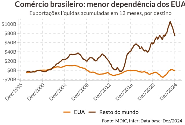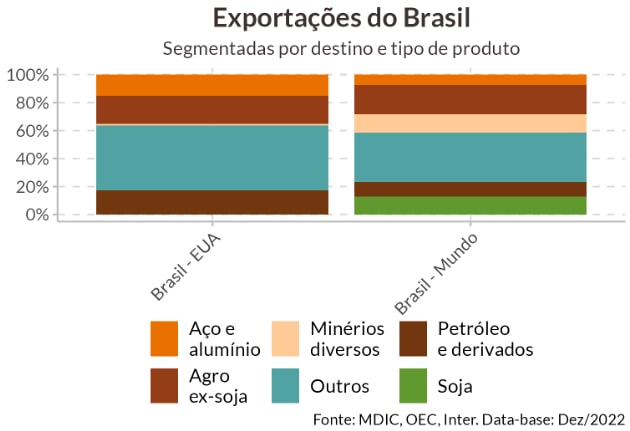 O impacto sobre a economia brasileira é misto. Por um lado, o fato do Brasil ter recebido a menor alíquota, coloca as exportações brasileiras para os Estados Unidos em posição privilegiada, podendo ganhar market-share. Além disso, caso haja retaliações por parte dos outros países, o Brasil pode observar um aumento na demanda por suas exportações. Entretanto, para esse movimento dependerá do impacto das tarifas sobre a economia do resto do mundo, em particular da União Europeia e da China. Se a China entrar em recessão por conta das tarifas de 54% em seus produtos, podemos ver um efeito líquido negativo nas nossas exportações.