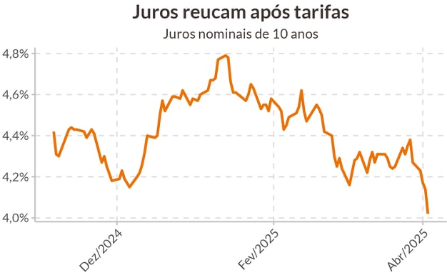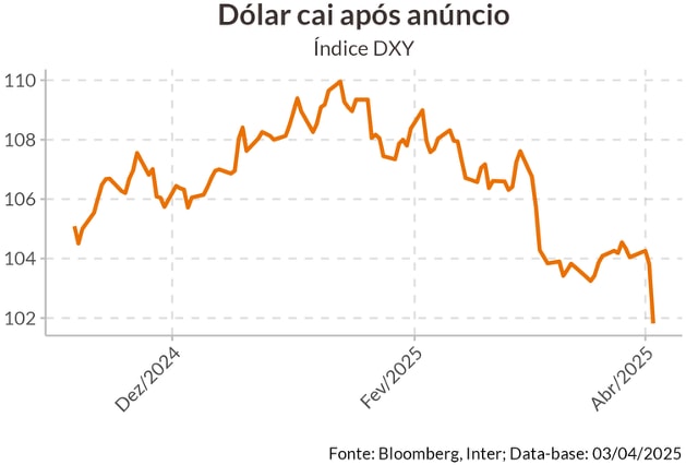 Os mercados reagiram muito mal ao anúncio. Havia a expectativa de que as tarifas seria uniformes para todos os países, devido a sua fácil implementação, e foi algo ventilado por membros do alto escalão do governo Trump ao longo da semana. Com o anúncio das tarifas efetivas, tanto os juros americanos quanto o dólar caíram fortemente. A taxa de 10 anos recuou de 4,23% para 4,04%, enquanto o dólar, medido pelo índice DXY, caiu mais de 2%.