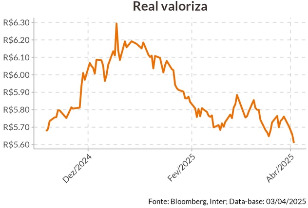 Além disso, devemos ver um impacto positivo sobre o real, que pode surfar a onda de desvalorização global do dólar. Na abertura da sessão de hoje o real chegou a cotar R$5,61, menor valor desde outubro. Por outro lado, os juros futuros podem cair, acompanhando o movimento global, mas isso não é necessariamente uma boa notícia, pois reflete uma visão de recessão na economia americana, o que pode se transformar em uma recessão global, especialmente se houver retaliação por parte dos outros países.