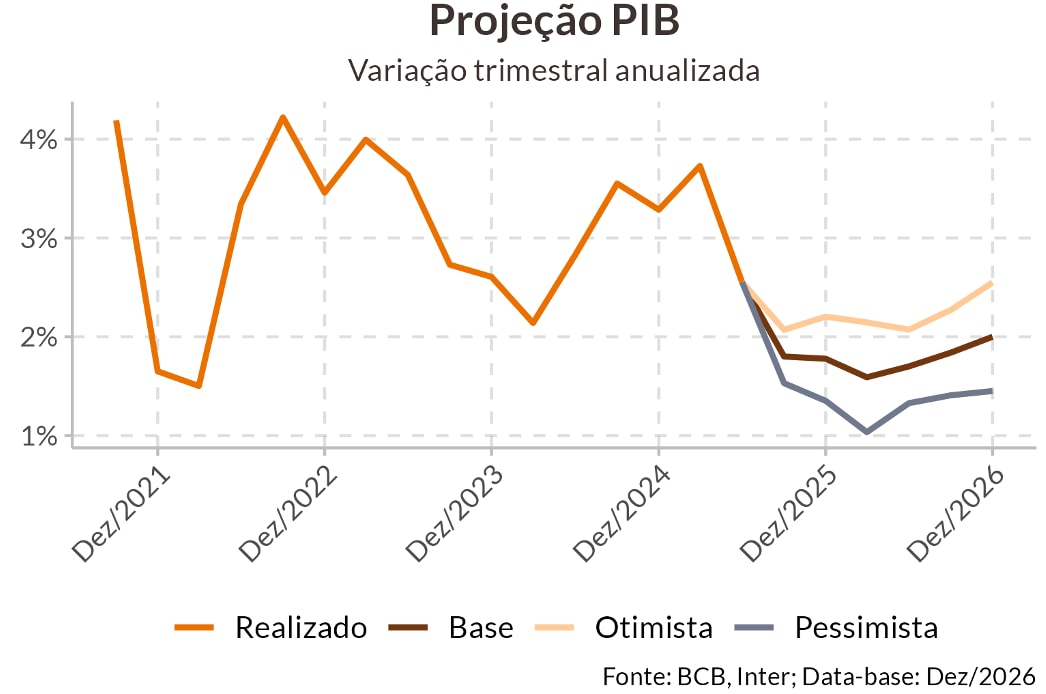 A economia brasileira teve mais um ano robusto em 2025, mesmo diante de juros elevados. O PIB deve encerrar com alta de 2,1%, apoiado sobretudo no setor de serviços, cuja resiliência decorre de menor dependência de crédito. Essa dinâmica, no entanto, perde fôlego com os efeitos defasados da política monetária. As sondagens de confiança já operam em terreno contracionista e, embora o ciclo de cortes de juros deva começar no início de 2026, a política monetária permanecerá restritiva por período prolongado. Nesse contexto, esperamos que o crescimento modere em 2026, com o PIB encerrando com alta de 1,8%, ainda impulsionado por novo aumento de gastos públicos.