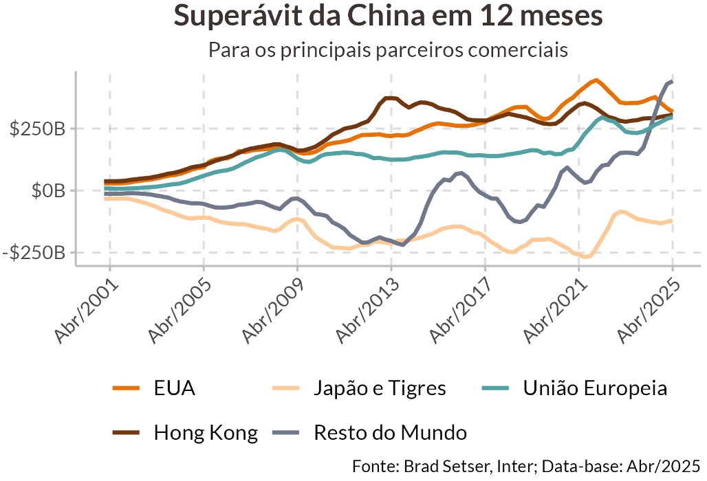 Indo além dos Estados Unidos, vimos a China mantendo a tendência de desequilíbrio externo, dependente do mercado externo para absorver seu excesso de produção, uma vez que a demanda doméstica está enfraquecida desde a pandemia, e o governo chinês reluta em utilizar políticas de estímulo. Na verdade, o que se viu desde o estouro da bolha imobiliária em 2021 foi o redirecionamento de capital para o setor industrial. Nesse contexto, o superávit comercial chinês é o maior do mundo, e o país já tem recorrido à parceiros não tradicionais para absorver sua produção, mesmo antes do tarifaço.