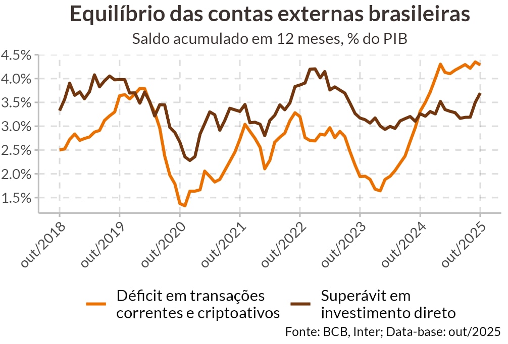 Nas contas externas, o quadro se deteriorou em 2025, com o déficit em transações correntes alcançando 3,5% do PIB. O principal vetor foi a piora do saldo comercial, diante do aumento das importações. Por outro lado, o Brasil tem atraído investimento estrangeiro suficiente para cobrir o desequilíbrio corrente. Um tema estrutural que ganhou peso foi a saída líquida de dólares por meio de criptoativos, especialmente via stablecoins, que dobrou após o aumento do IOF sobre operações cambiais em maio, impondo um desafio adicional ao balanço de pagamentos.