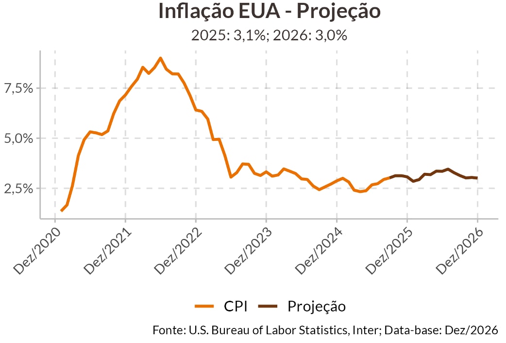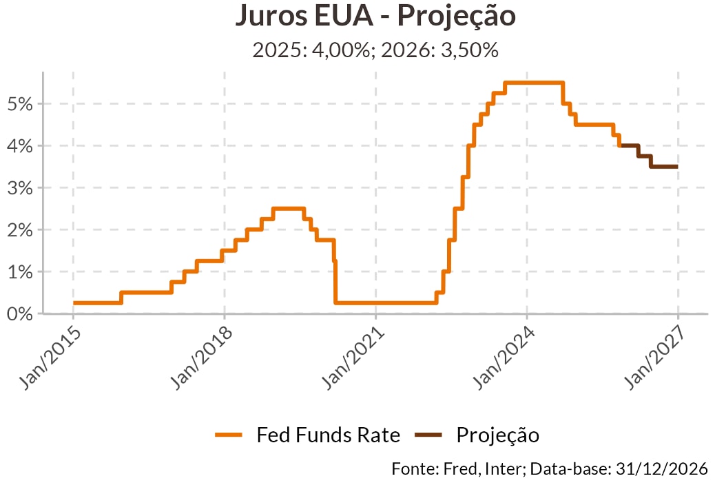 Para 2026, entretanto, vemos pouco espaço para cortes. A inflação deverá continuar pressionada e distante da meta, oscilado ao redor de 3%-3,4%. Vemos espaço para apenas mais um corte de 25 pontos base e apenas a partir do 2º trimestre. Ao mesmo tempo, esperamos que a atividade continue em patamar robusto, com o mercado de trabalho em equilíbrio. Além disso, o tema de investimentos em capacidade produtiva de IA deve continuar no centro das atenções em 2026, mas com um olhar um pouco mais cauteloso por parte do mercado, que começa a fazer contas a respeito da viabilidade dos investimentos projetados.