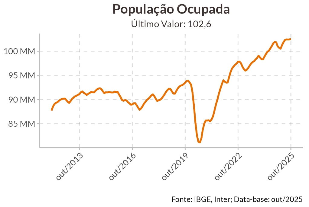 O mercado de trabalho foi mais uma vez destaque positivo. A taxa de desemprego atingiu mínima histórica de 5,4%, e a massa salarial real avançou 5% no ano. A população ocupada chegou a 103 milhões de pessoas, patamar recorde. A melhora foi também qualitativa: o emprego formal cresceu mais do que o informal. Embora a taxa de participação ainda não tenha retornado ao nível pré-pandemia, ajustes em programas sociais podem ampliar a oferta de trabalho, permitindo crescimento com menor pressão inflacionária. O rendimento médio avança cerca de 4% aa acima da inflação, o que, se por um lado reforça o consumo, por outro pressiona a inflação de serviços. Com o aperto monetário prolongado, a expectativa é de acomodação gradual do mercado de trabalho em 2026, ainda em um nível melhor do que a média histórica, o que tende a sustentar a demanda das famílias.