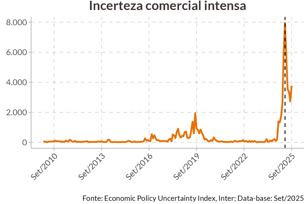 A nova política comercial americana levou a tarifa efetiva da economia americana para próximo a 20%, o maior valor em quase 100 anos. A sua implementação, por si só, já seria fonte de incerteza, mas foi agravado pela errática na política, com direito a guerra tarifária com a China que levou ambos a implementarem tarifas temporárias de até 150% um contra o outro.