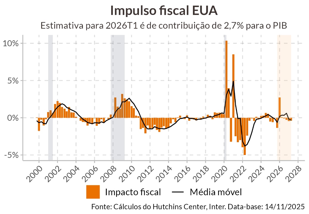 O grande risco para esse cenário é a reaceleração global, levando a um movimento de reflação. 2026 caminha para ser um ano de muitos estímulos em diversos países. Nos Estados Unidos, além dos cortes na taxa de juros, vamos observar um impulso fiscal no 1º trimestre, reflexo da One Big Beautiful Bill Act, conjunto de políticas fiscais do governo Trump aprovadas em 2025. Apesar das medidas que elevem a arrecadação, não entrarão em vigor em 2026, enquanto diversas medidas que impliquem em aumento de gastos, sim.