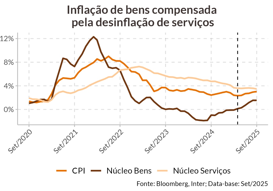 Na política monetária, após corte de 100 pontos base da taxa de juros em 2024, o Fed iniciou 2025 em estado de paralisia devido à incerteza tarifária. Mesmo com o mercado de trabalho mantendo robustez e a inflação abaixo do esperado no 1º semestre, o Fedadiou novos cortes devido à incerteza. Por um lado, as tarifas poderiam causar inflação, por outro poderiam desacelerar a economia.