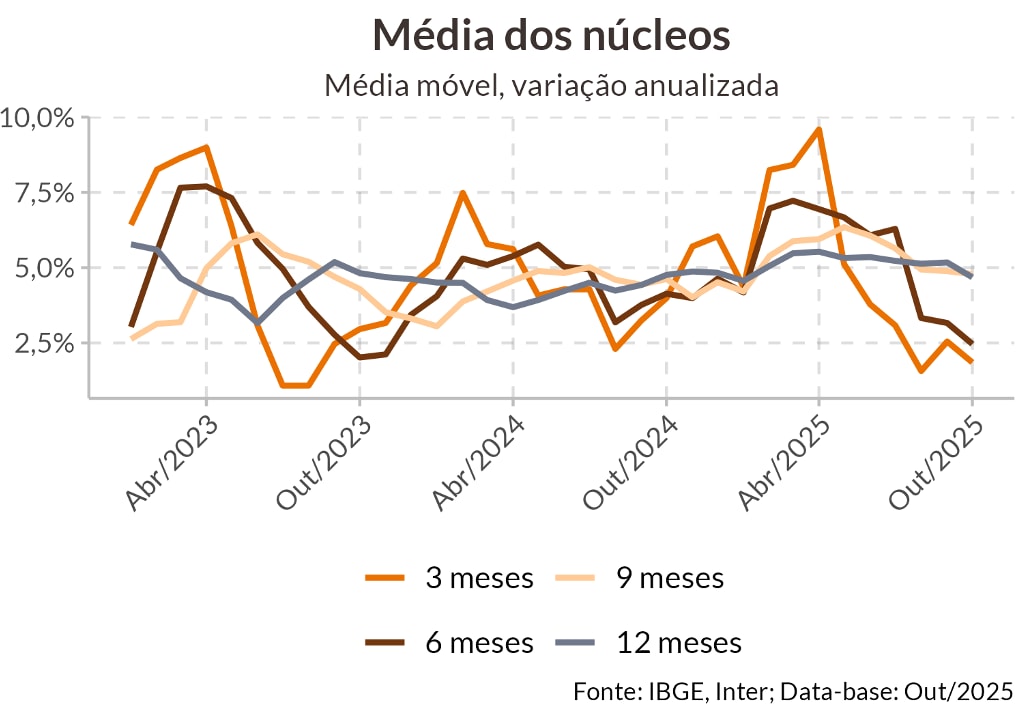 A inflação mostrou alívio ao longo de 2025, beneficiada pela apreciação do real e pela queda dos preços de commodities. A expectativa é de que o IPCA feche o ano em 4,4%, dentro do teto da meta. A desinflação também aparece nos núcleos, refletindo a atividade mais moderada e a política monetária mais dura. Mantidas as condições atuais, o IPCA tende a encerrar 2026 próximo de 4%, com convergência ao centro da meta em 2027, por volta de 3,4%.