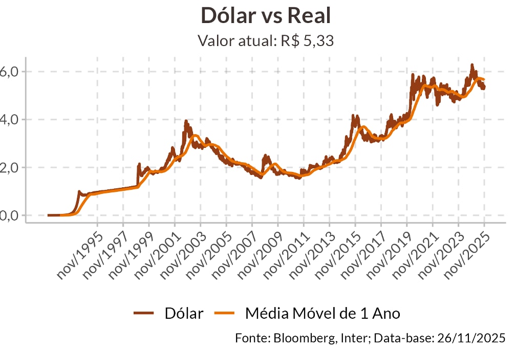 Por fim, o câmbio refletiu uma combinação de fatores externos e internos. O diferencial de juros permaneceu elevado, contribuindo para a atratividade do real, que apreciou cerca de 13%, também beneficiada pela desvalorização do dólar no mundo. A tendência para 2026 é de manutenção do dólar em patamar relativamente deprimido, embora o calendário eleitoral deva elevar a volatilidade.