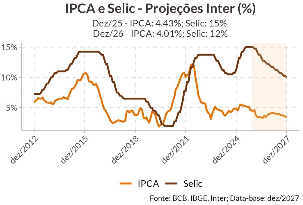 Com a queda das expectativas e as projeções oficiais apontando inflação na meta no horizonte relevante, há espaço para o início do ciclo de cortes já na primeira reunião de 2026. Ainda assim, a política monetária deve seguir em campo contracionista ao longo do ano, com a Selic terminando 2026 em torno de 12%.