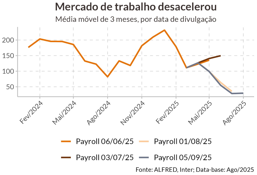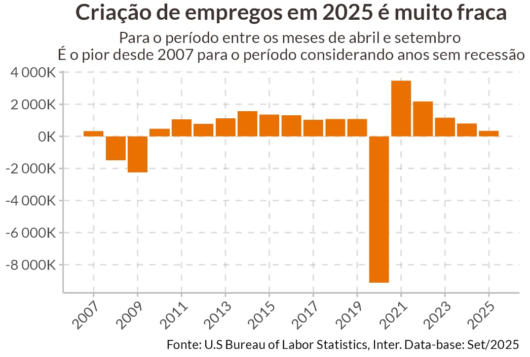 Os impactos das tarifas ficaram claros a partir de agosto. Observou-se uma aceleração na inflação de bem, compensada por uma desinflação em serviços. No entanto, o principal impacto foi no mercado de trabalho, com contratações praticamente paralisando após abril. E isso só ficou claro após as revisões do Payroll, que indicaram que a situação era pior que o dado inicialmente indicava, com a economia americana tendo adicionado 351 mil empregos entre abril e setembro, o menor valor para esse período desde 2007 para um ano sem recessão.
