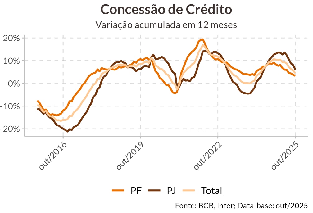 No crédito, o ambiente restritivo freou, mas não travou a expansão. O saldo total cresceu 10% em 2025, desacelerando em relação aos 15% de 2024. Parte disso reflete canais de transmissão menos eficientes, com incentivos vindos do mercado de capitais e o uso, ainda que caro, de linhas como o rotativo pelas famílias. Nos últimos anos, o aumento da renda sustentado tanto pela forte criação de empregos quanto pelas transferências do governo, deu lastro à expansão do crédito às famílias. Na margem, porém, as concessões desaceleraram, exemplo no imobiliário, afetado pela maior restrição da poupança. Mesmo assim, o crédito habitacional contou com subsídio do Minha Casa, Minha Vida, que amorteceu o impacto dos juros altos sobre e ajudou a mitigar a desaceleração na construção civil.