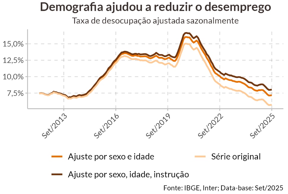 Outra fatia da redução na taxa de desemprego pode ser atribuída à alterações demográficas: com o envelhecimento populacional e a democratização do ensino superior, o Brasil se tornou um país distintamente mais maduro e escolarizado do que no último ciclo econômico. Conjuntamente, outra regra de bolso na economia dita um menor risco de desemprego para trabalhadores maduros e instruídos.