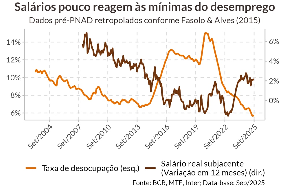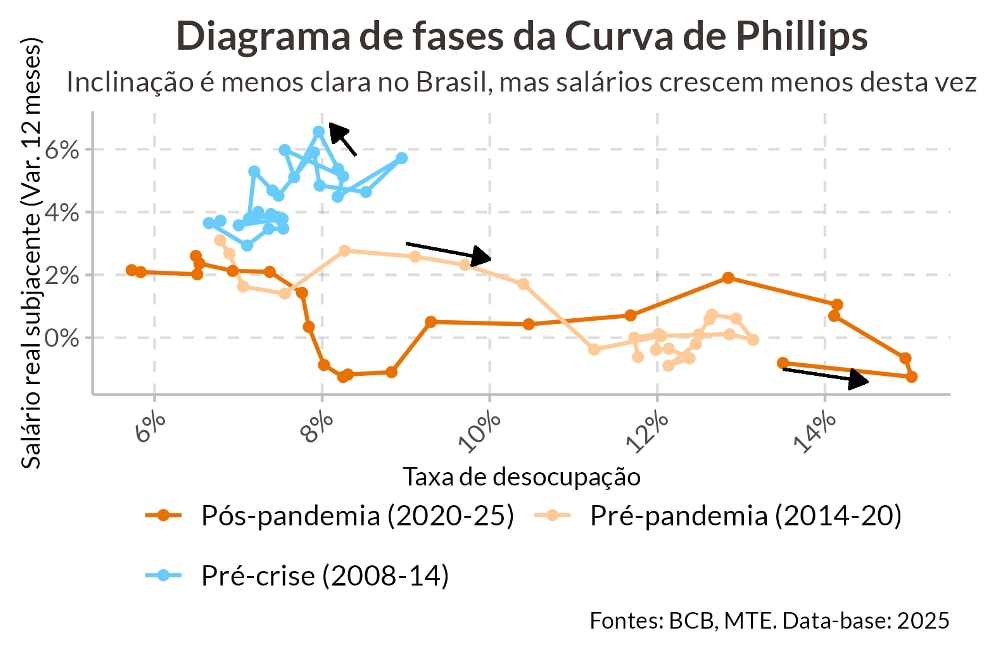 No Brasil, a relação entre as duas variáveis é mais complicada: conforme a nossa medida de crescimento do salário real subjacente, o comportamento do mercado de trabalho brasileiro não tem sido uniforme ao longo dos últimos ciclos econômicos e o quadro geral mais se assemelha a uma “reta” de Phillips, onde os salários pouco reagem à taxa de desocupação.Porém, mesmo com essa situação pouco convencional, fica evidente o baixo crescimento do poder de compra dos trabalhadores atrelado ao menor desemprego observado em quase 40 anos, conforme estudo publicado pela FGV.