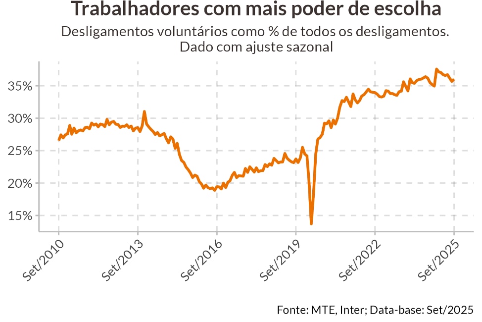No nosso entendimento, o problema não está no canal de barganha: a taxa de desligamentos voluntários no setor formal praticamente dobrou desde as mínimas de 2016 para atingir recordes históricos, indicando que trabalhadores têm tido muito mais capacidade para aceitar melhores ofertas de emprego enquanto já estão ocupados.