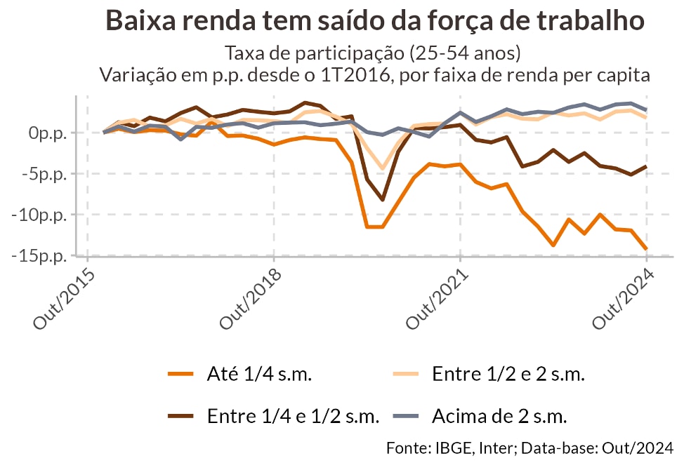 Esse déficit possui fortes distinções socioeconômicas: enquanto a participação em idade ótima (25-54 anos) dos estratos mais favorecidos da população aumentou levemente nos últimos anos, o mesmo indicador despencou para a população que recebe até meio salário mínimo per capita, correspondendo a uma perda agregada de 1,6p.p. na força de trabalho desde o 4T19. Embora parte das saídas sejam de trabalhadores desmotivados por conta de fatores de saúde ou insalubridade (prováveis cicatrizes dos efeitos sanitários da Covid-19), grande parte da redução na taxa de participação ocorreu de maneira definitiva para este segmento da população.