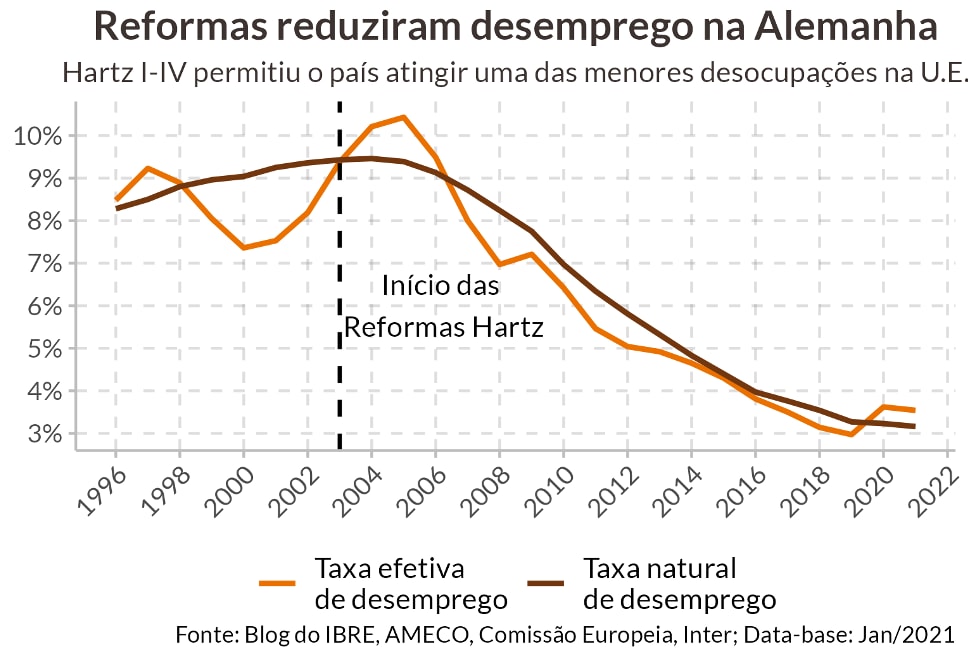 Conjuntamente, é também provável que a implementação de reformas econômicas nos últimos anos tenha alterado a estrutura da economia brasileira de modo a acomodar uma menor taxa de desemprego sem pressionar os salários: com a Reforma Trabalhista e a Lei de Liberdade Econômica, além da flexibilização dos vínculos de trabalho por meio de ocupações em aplicativos, empregar mão de obra se tornou mais fácil do que antes no Brasil, assim repetindo os efeitos das reformas Hartz I-IV que transformaram significativamente o mercado de trabalho da Alemanha na década de 2000 e contribuiu para que o país atingisse uma das menores taxas de desemprego na União Europeia de maneira sustentável.