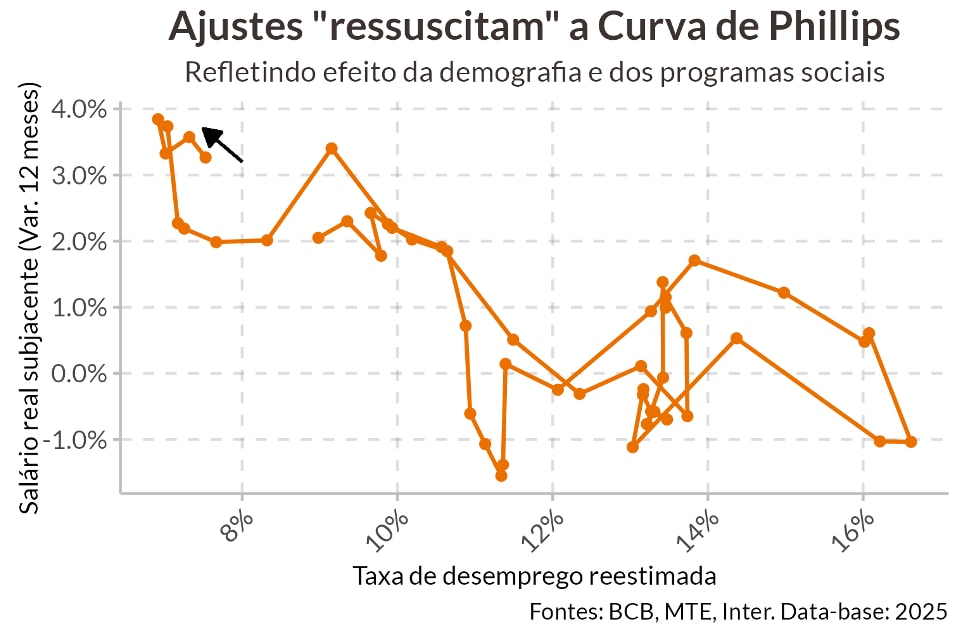 De todo modo, apenas nos atendo às alterações estruturais citadas nesse relatório, encontramos que os efeitos demográficos e o efeito dos programas sociais na taxa de participação da força de trabalho provocaram uma redução de aproximadamente 3,3p.p. na taxa de desocupação desde 2012. Logo, caso as mesmas condições de oferta de mão de obra encontradas no início da PNAD Contínua prevalecessem hoje em dia, teríamos um desemprego de cerca de 9% que ainda estaria 2p.p. aquém das mínimas atingidas em 2014 e que colocaria o cenário do mercado de trabalho brasileiro numa posição coerente com a Curva de Phillips – sendo essa relação restaurada após a incorporação destes ajustes.
