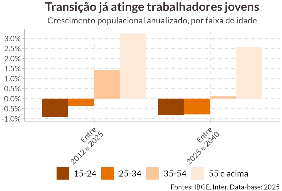 Estes achados indicam que a taxa natural de desemprego – nível que estabiliza o ritmo de crescimento dos salários – provavelmente reduziu nos últimos anos, também trazendo coerência para a dicotomia inicialmente apontada. Conforme o avanço da transição demográfica na próxima década, devemos notar uma redução ainda mais aguda dos jovens trabalhadores e estabilização do contingente mais maduro, intensificando os desafios de oferta para as empresas brasileiras.