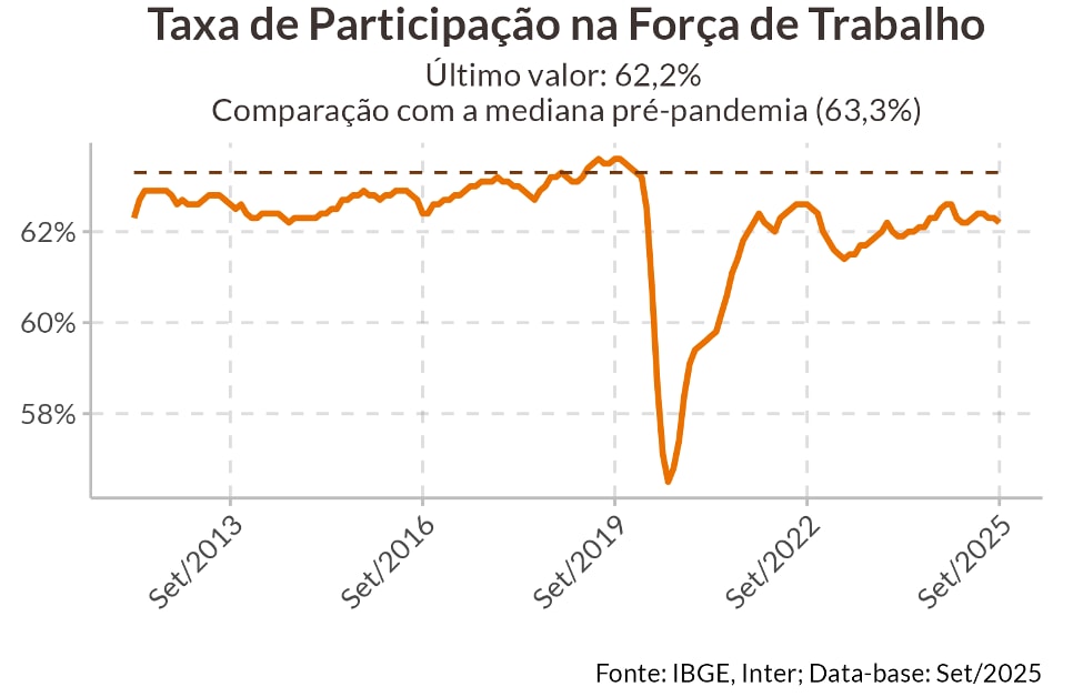 No lado da oferta, a história é diferente: temos visto uma taxa de participação recorrentemente abaixo dos níveis pré-pandemia apesar do bom poder de barganha dos empregados, que em tese encorajaria a inclusão dos indivíduos à margem do mercado até formar um equilíbrio entre a oferta e demanda por vagas de emprego.