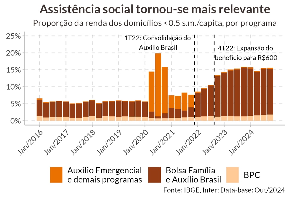 Parte da explicação para a abertura da “boca de jacaré” na força de trabalho está, por sua vez, fundamentada na expansão dos programas de assistência social ao longo do mesmo período: a Pnad indica que as transferências como proporção da renda dos domicílios mais pobres triplicou entre o 4T19 e o 4T24, aproximando-se do auge do Auxílio Emergencial, que chegou a ser fonte de 20% dos rendimentos da mesma faixa socioeconômica.