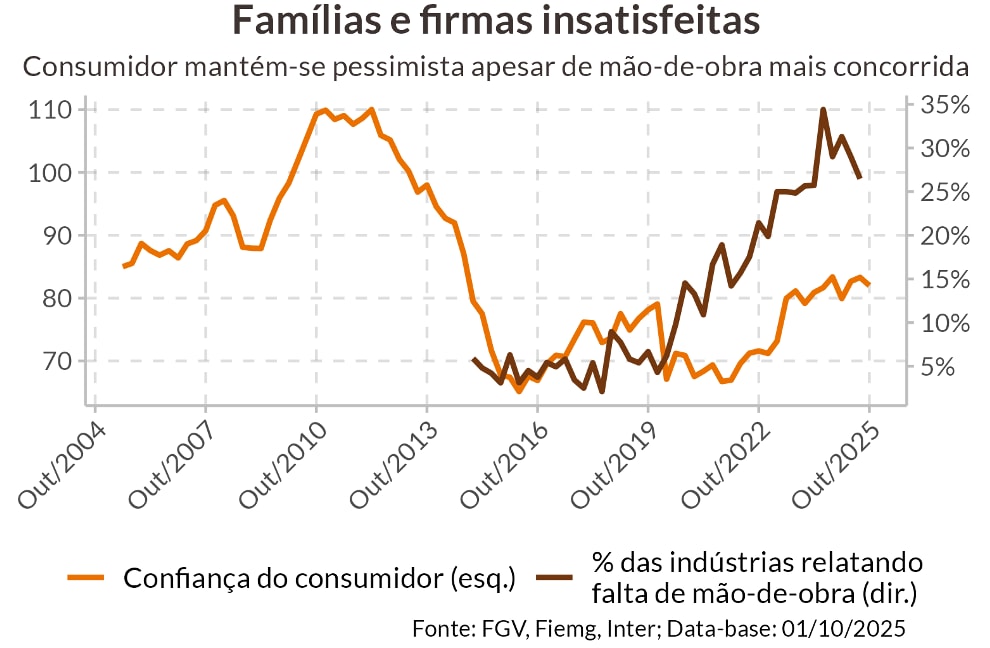 Porém, a recuperação nos dados não se traduziu em melhora no ânimo das famílias, com a confiança do consumidor amplamente abaixo do período pré-2014, também não refletindo a escassez de mão de obra que passou a ser relatada pelas empresas após a pandemia. Temos, portanto, uma situação paradoxal: firmas relatam condições difíceis para obter trabalho, e famílias não relatam melhora em seu padrão de consumo, que está atrelado às condições salariais.