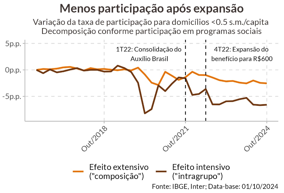 Como regra de bolso, domicílios cadastrados em programas sociais possuem menor inclusão no mercado de trabalho, e a ampliação do atual Bolsa Família está associada com redução equivalente a 0,5p.p. na força de trabalho agregada. Porém, a causalidade deste efeito composição não é necessariamente clara, e pode refletir a entrada de famílias na lista de beneficiários após alguma condição que gerou saída do mercado de trabalho.
