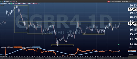 Acima da resistência atual, já testada inúmeras vezes ao longo do ano, a ação tende acessar região que caiu de forma rápida no final de 2024, e poderá apresentar reversão na mesma velocidade, para mirar topo de dezembro de 2024 (região de 21 reais).
